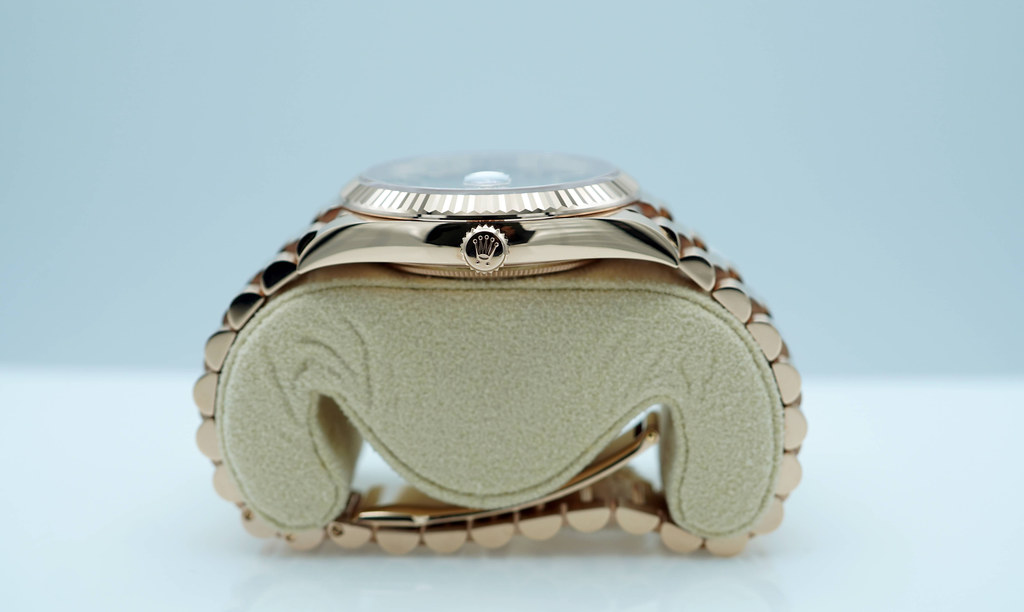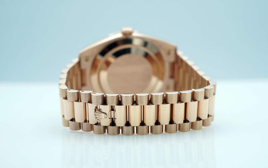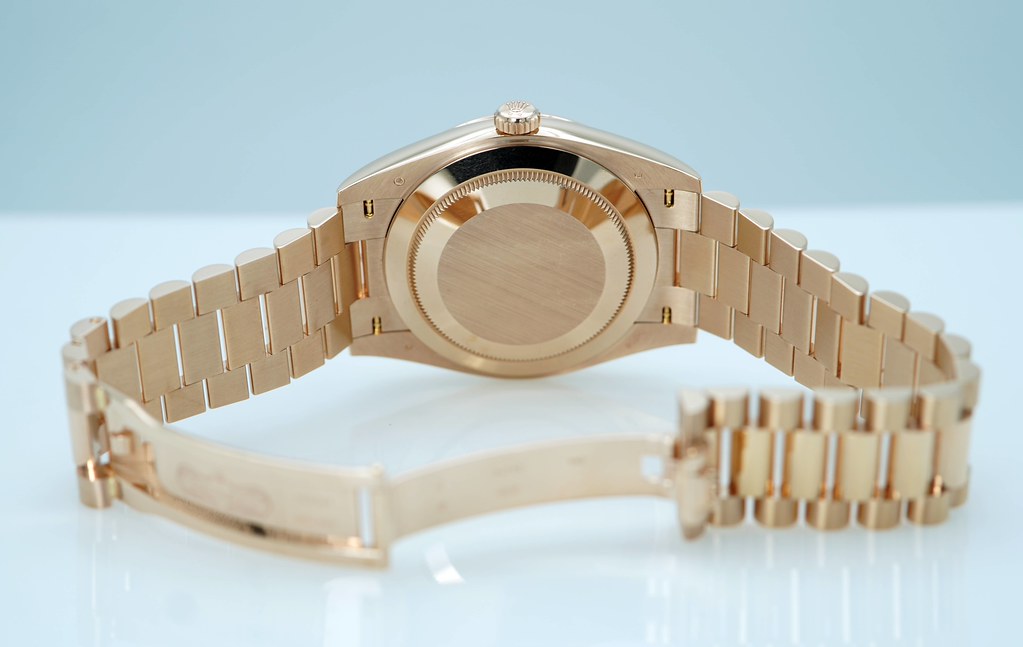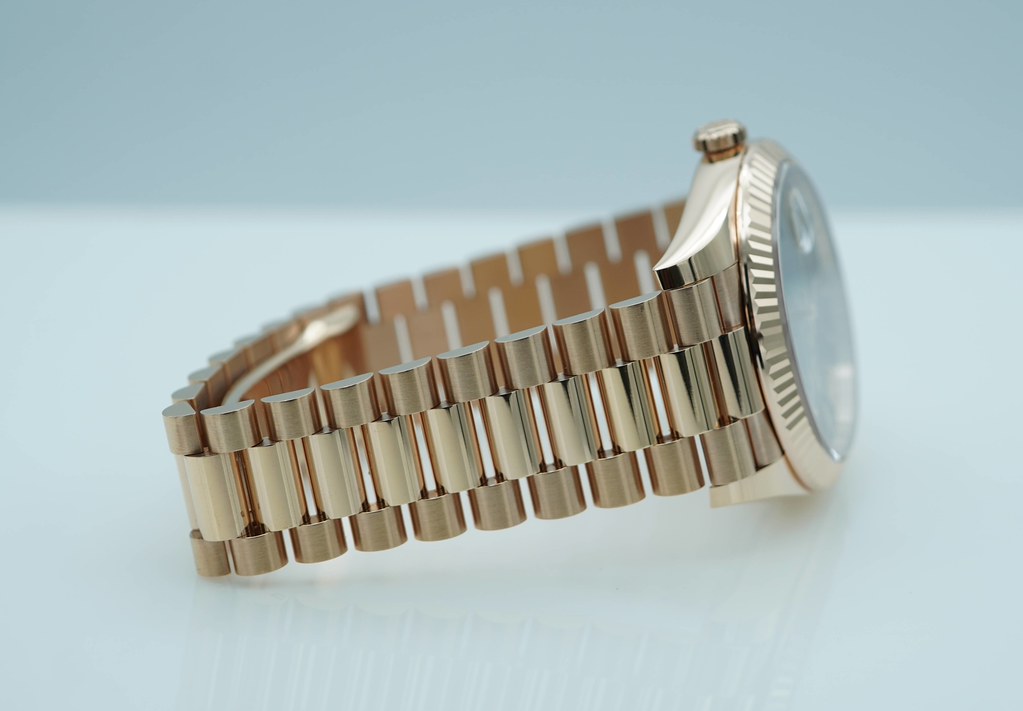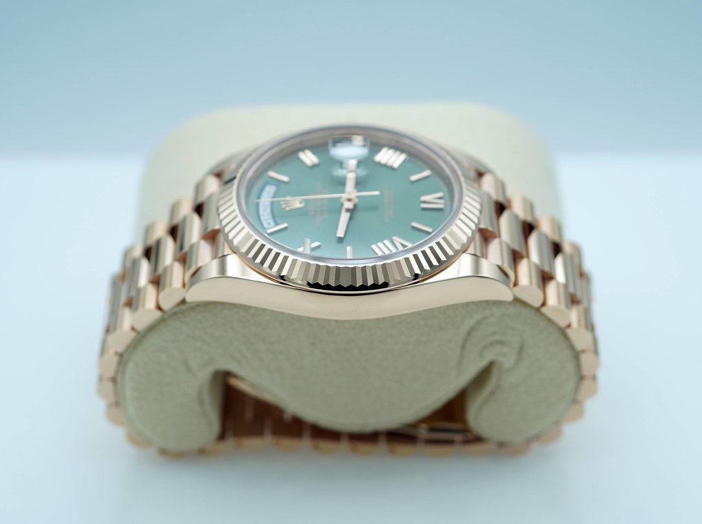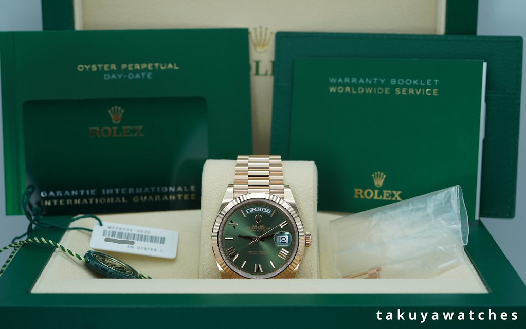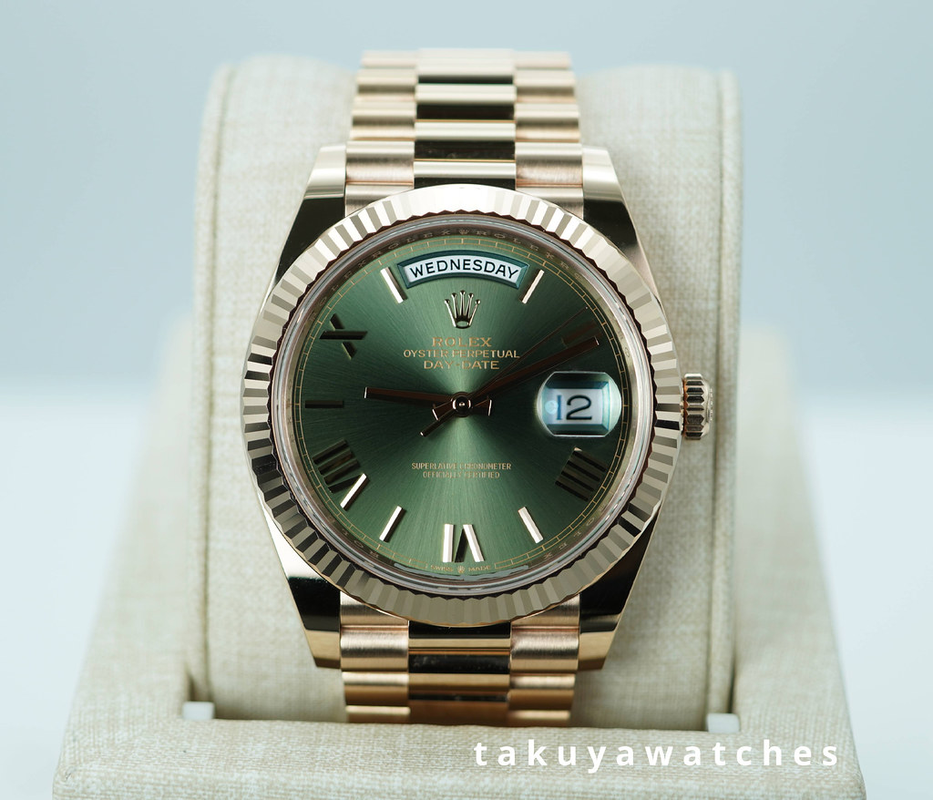 An Excellent, Unpolished Condition & Very Beautiful 60th Anniversary Model 2024 40mm Rolex 228235 Day-Date President 18K Rose Gold with Olive Green Roman Dial. Purchased from Rolex Authorized Dealer in 02.2024.