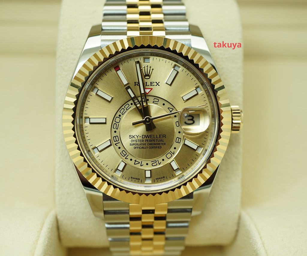 An Excellent Condition & Very Beautiful 2021 42mm Rolex Annual Calendar 326933 Skydweller 18K Yellow Gold & Stainless Steel, Beautiful Champagne Dial & on Jubilee Bracelet. Purchased from Rolex Authorized Dealer in 09.2021.