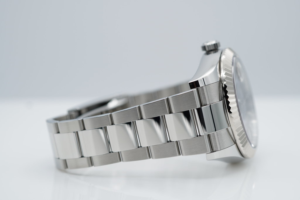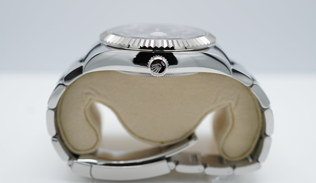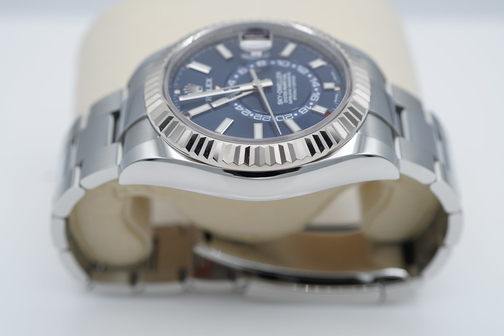 An Excellent Condition & Very Beautiful 2021 42mm Rolex Annual Calendar 326934 Skydweller Stainless Steel with 18K White Gold Fluted Bezel & Beautiful Blue Dial. Its on Oyster Bracelet. Purchased from Rolex Authorized Dealer in 07.2021.