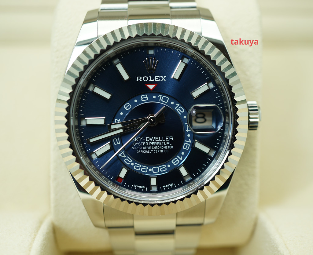 An Excellent Condition & Very Beautiful 42mm Rolex Annual Calendar 326934 Skydweller Stainless Steel with 18K White Gold Fluted Bezel, Blue Dial, & on Oyster Bracelet. Purchased from Rolex USA Authorized Dealer in 04.2019.