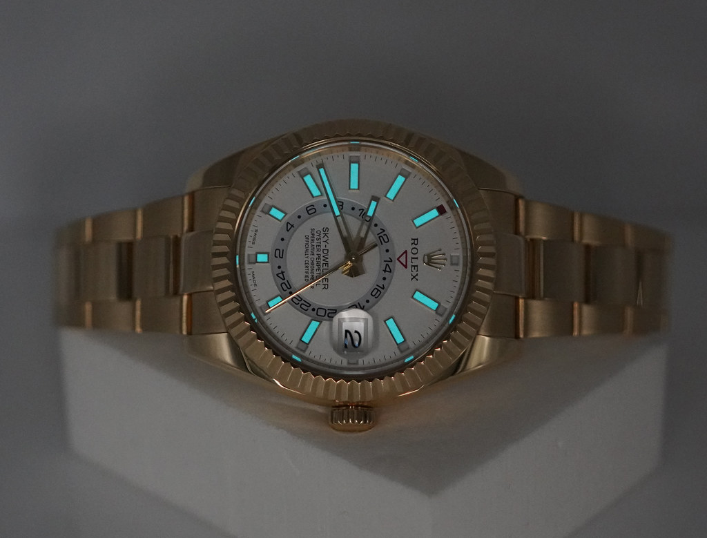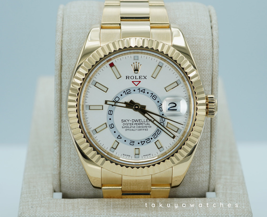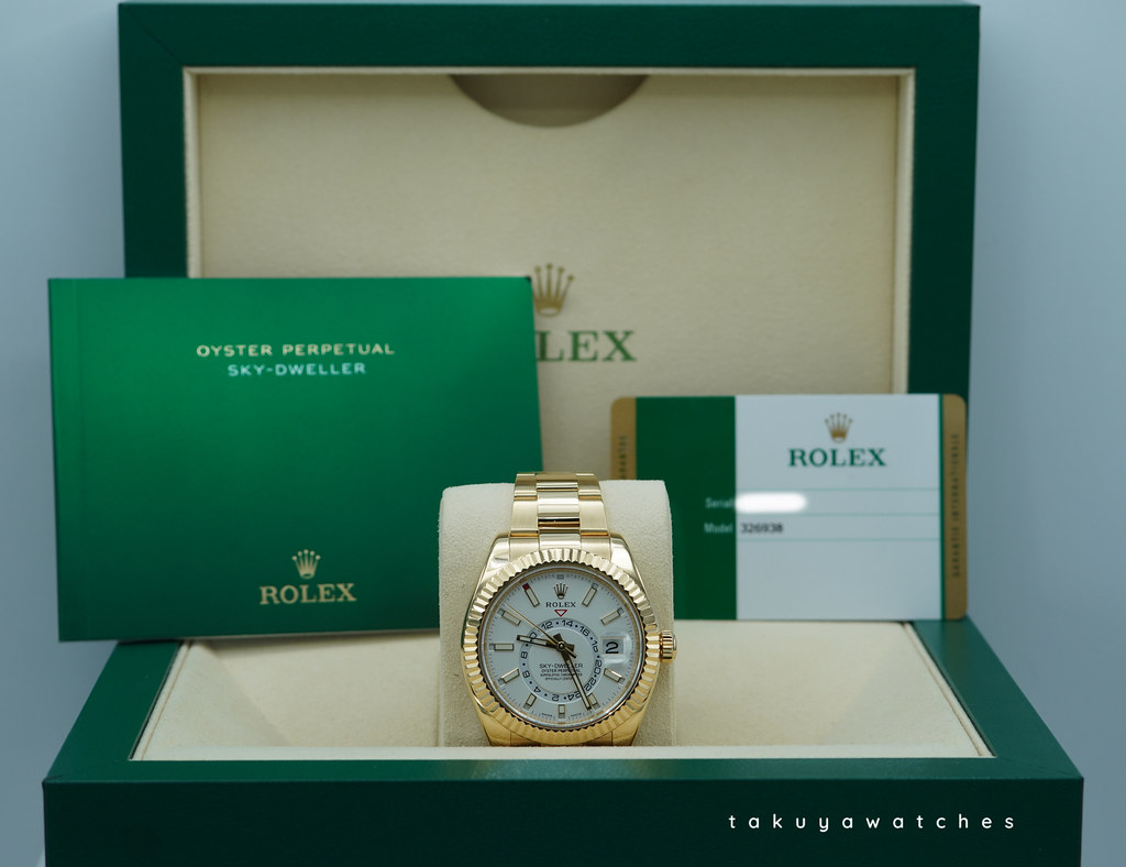 A Great Condition & Very Beautiful 2019 42mm Rolex Annual Calendar 326938 Skydweller 18K Yellow Gold with White Index Dial. Purchased from Rolex Authorized Dealer in 12.2019.
