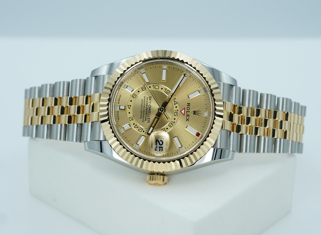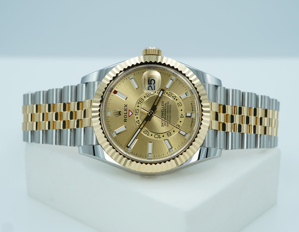 An Excellent Condition & Very Beautiful New Model 2024 42mm Rolex Annual Calendar 336933 Skydweller 18K Yellow Gold & Stainless Steel with Champagne Dial. Its on Jubilee Bracelet. Purchased from Rolex Authorized Dealer in 07.2024. Watch running perfect with Non Issues. Full Links. Full Set & Under 5 Years Factory Warranty.