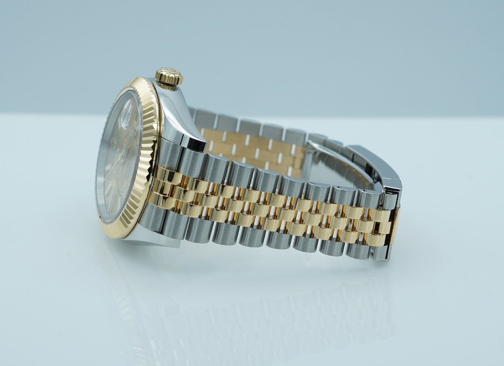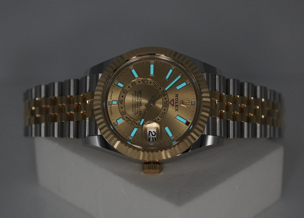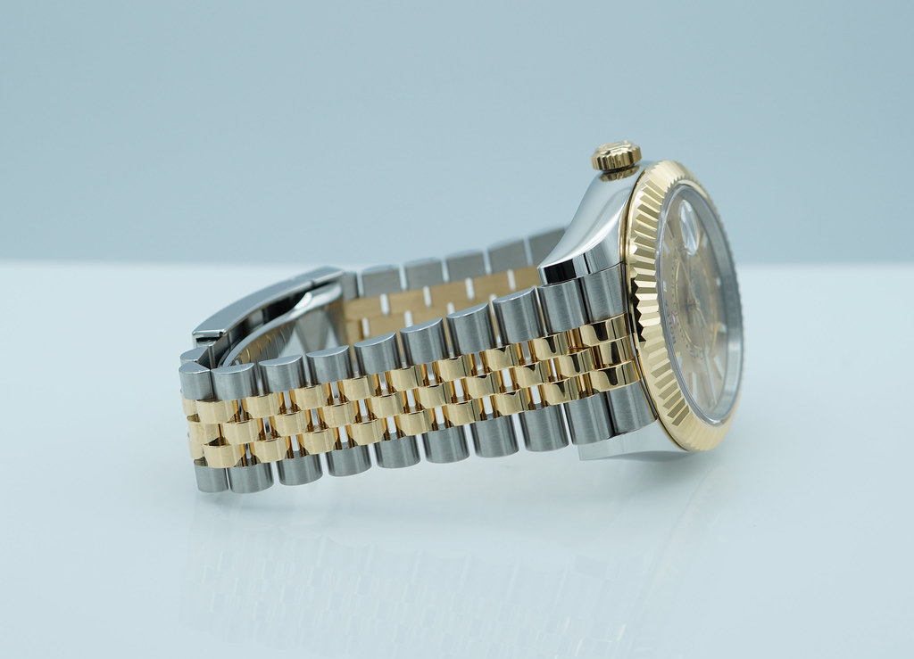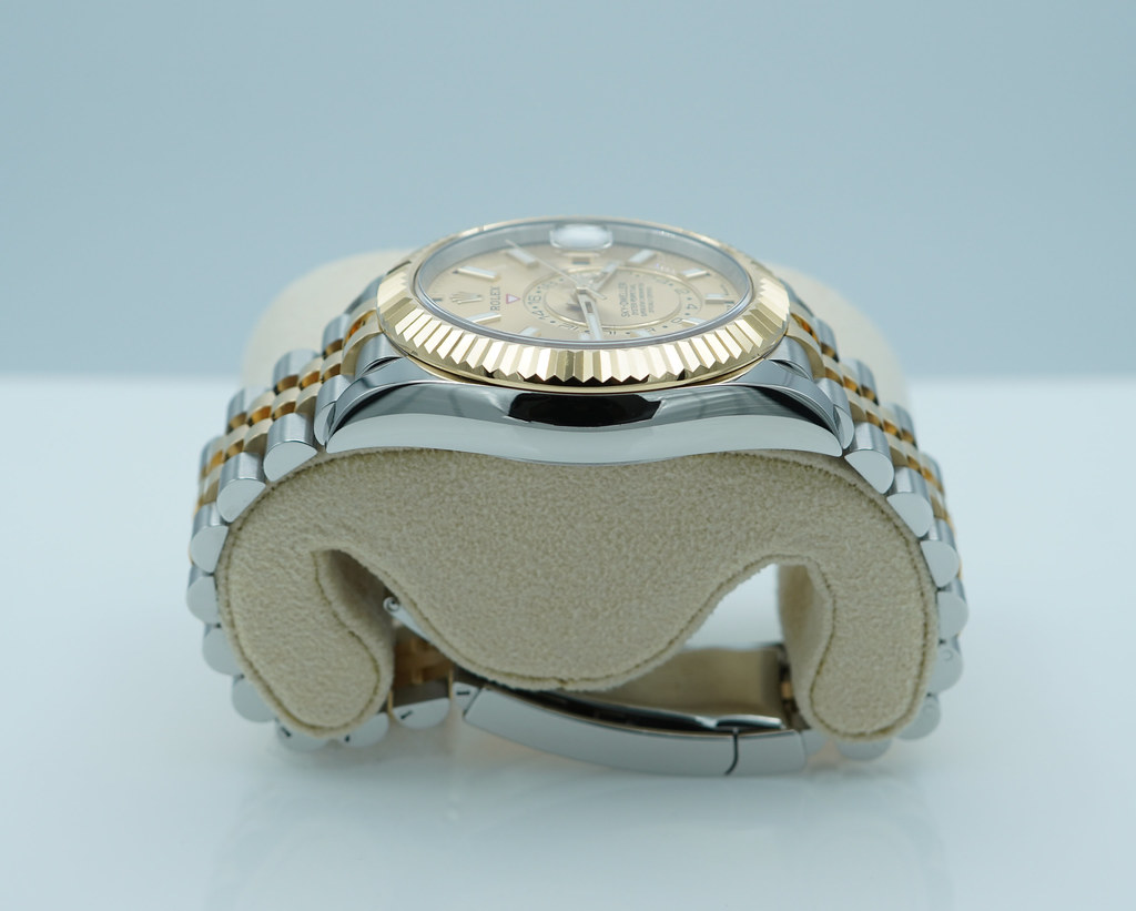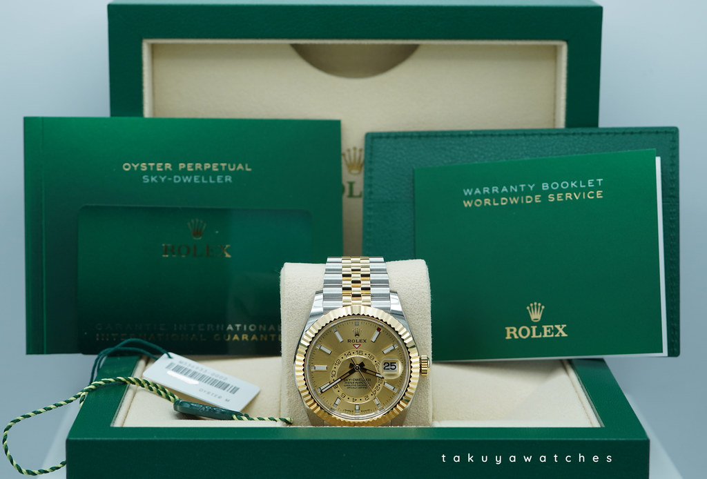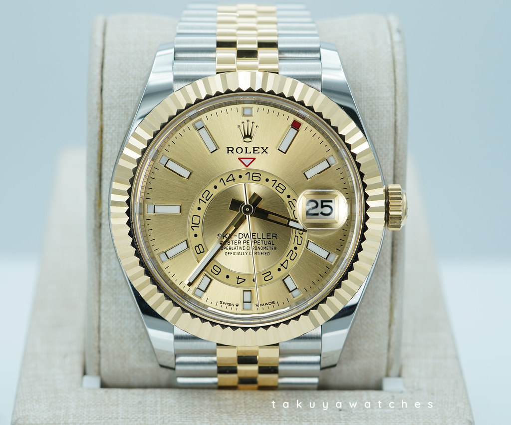 An Excellent Condition & Very Beautiful New Model 2024 42mm Rolex Annual Calendar 336933 Skydweller 18K Yellow Gold & Stainless Steel with Champagne Dial. Its on Jubilee Bracelet. Purchased from Rolex Authorized Dealer in 07.2024.
