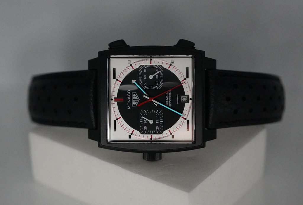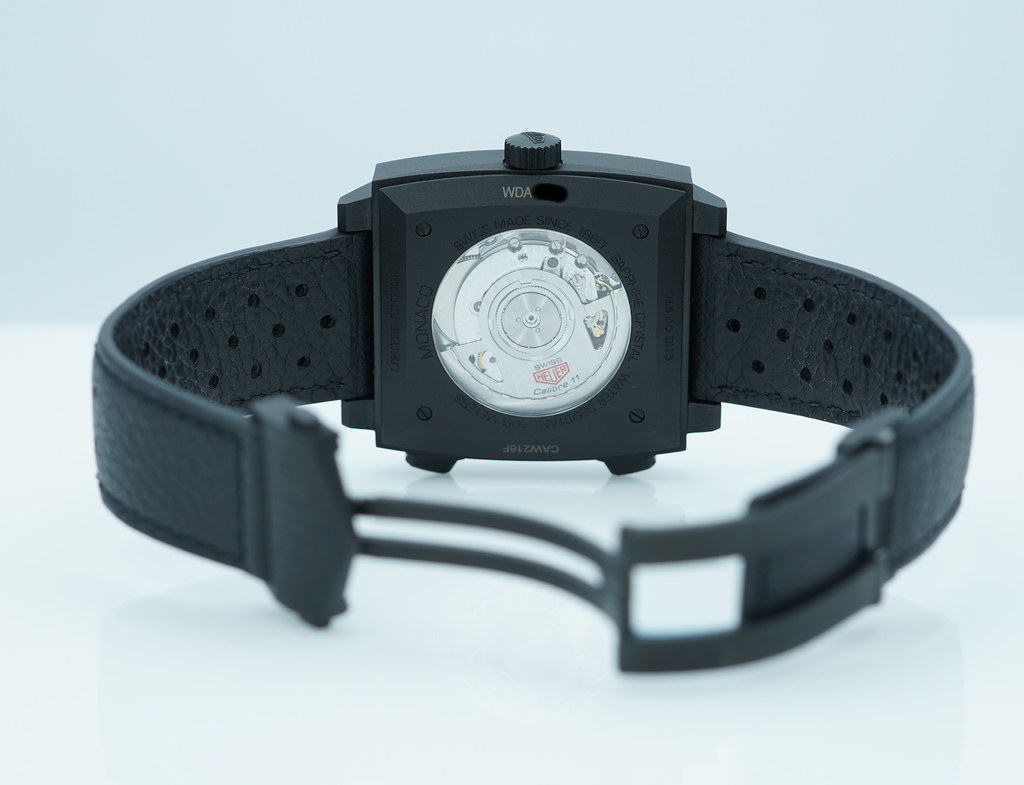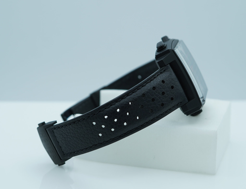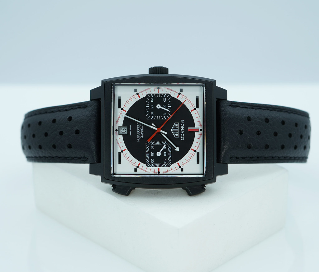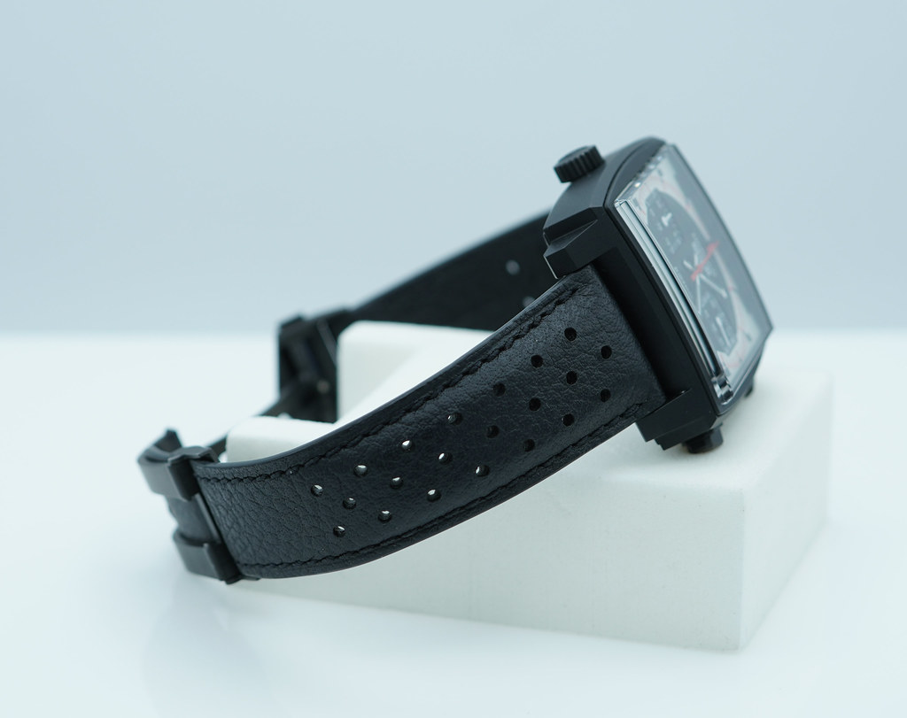A Like New Condition & Very Beautiful 2025 Limited Edition of 970 Pieces Only, 39mm TAG Heuer CAW218F Monaco Calibre 11 Automatic Chronograph in Titanium with Black DLC Coated. Black & Silver Dial with Red Accents. It’s on Black Leather Strap Seth Folding Clasp. Purchased from TAG Heuer USA Authorized Dealer in 2025.