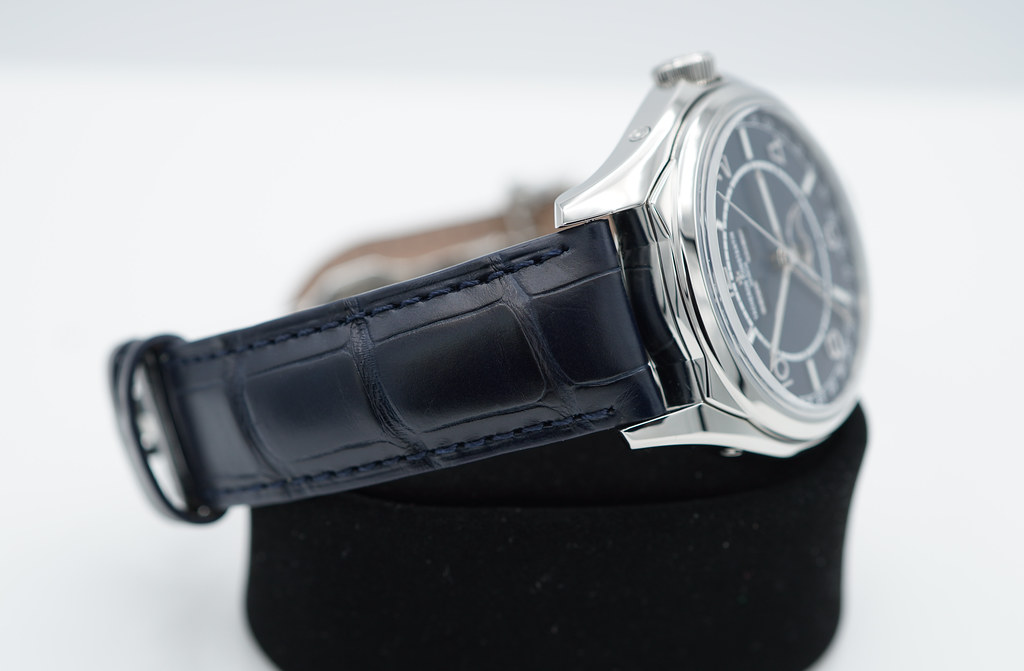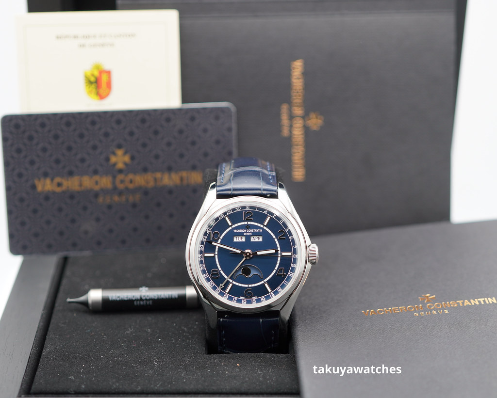 An Excellent Condition & Very Beautiful 40mm Vacheron Constantin Fifty Six 4000e Complete Calendar Stainless Steel with Beautiful Blue Dial, on Blue alligator Mississippiensis strap & stainless steel deployant buckle. Caliber 2460 QCL/1 automatic movement with its Hallmark of Geneva certification. Purchased from Vacheron Constantin Authorized Dealer in 02.2021.