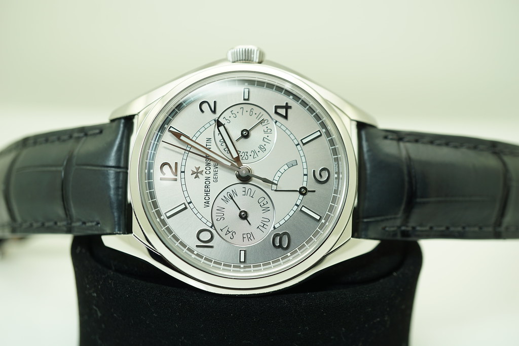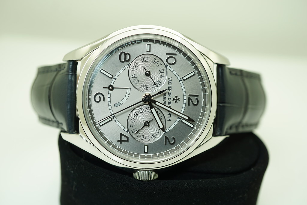 An Excellent Condition & Very Beautiful 40mm Vacheron Constantin Fifty-six Day Date Automatic, Stainless Steel Case with Grey Dial, & on Dark Grey Alligator Mississippiensis strap & Steel Deployant Buckle. Purchased from Vacheron Constantin Authorized Dealer in 03.2021. Watch Running Perfect with Non Issues. Full Set & Under 2 Years Factory Warranty.